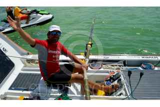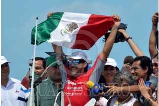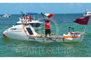 CANCÚN, QUINTANA ROO,14MARZO2015.- El remerista mexicano Abraham Levy, concluyó el dia de hoy la hazaña de recorrer mas de 9 mil kilometros que conforman el trayecto entre España y Cancún con mas de 4 meses transportándose en un bote llamado "cascarita" impulsado por su propia fuerza fue recibido por familiares amigos y autoridades en la Marina. FOTO: ELIZABETH RUIZ /CUARTOSCURO.COM