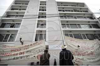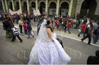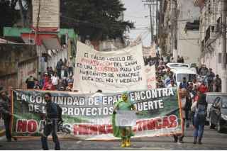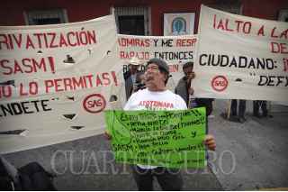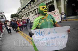 XALAPA, VERACRUZ, 14MARZO2015.- Organizaciones civiles, activistas, académicos, políticos, estudiantes y trabajadores sindicalizados del Sistema de Agua y Saneamiento (SAS) del puerto de Veracruz, iniciaron movilizaciones para exigir frenó a la iniciativa de Ley de Agua que se discute en la Cámara de Diputados, pues aseguran es una iniciativa para la privatización y control del agua. La concentración se llevó a cabo en la Plaza Lerdo en donde realizaron un tendedero informativo y fijaron su postura en contra de la llamada Ley Korenfeld en alusión al titular de la Comisión Nacional del Agua para después partir en manifestación hacía las instalaciones de la Conagua en la capital del estado y concluir de nueva cuenta frente al Palacio de Gobierno en donde colocaron carteles sobre la desaparición de los 43 normalistas de Ayotzinapa con la leyenda " Fue el Estado". FOTO: RUBÉN ESPINOSA / CUARTOSCURO.COM