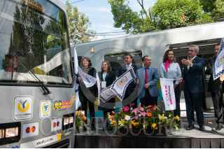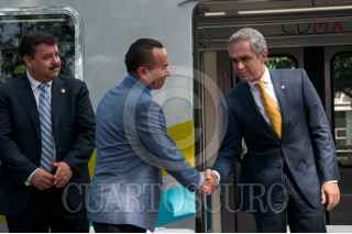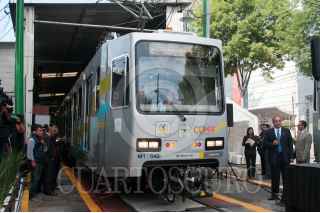 MÉXICO, D.F., 16MARZO2015.- Miguel Ángel Mancera, jefe de gobierno capitalino, acudió a las instalaciones del taller del Tren Ligero en Huipulco, a dar el banderazo de salida a 4 trenes ligeros nuevos que correrán en dicho sistema de Tasqueña a Xochimilco. Durante el evento asistieron Hiram Almeida, titular de la SSP DF, Rufino H. León Tovar, secretario de Movilidad capitalina, y Eduardo Venadero, director del Servicio de Transportes Eléctricos. FOTO: DIEGO SIMÓN SÁNCHEZ /CUARTOSCURO.COM