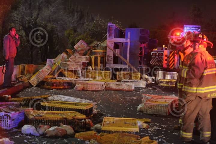 MÉXICO D. F., 18FEBRERO2015.- Un tráiler que transportaba pollos vivos de Morelos a Tizayuca en Hidalgo, volcó sobre Circuito Interior, a la altura de la glorieta de La Raza por el exceso de velocidad con que conducía el chofer quien quedo ileso de dicho accidente. En el lugar, Bomberos laboraron para recuperar los pollos que salieron de las jaulas y limpiar el lugar, ya que muchos animalitos murieron a causa del impacto. FOTO: LUIS CARBAYO /CUARTOSCURO.COM