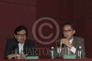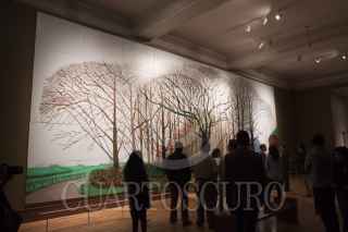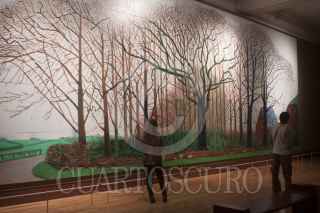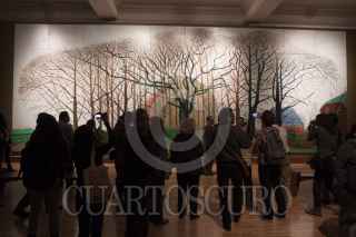 MÉXICO, D.F., 19MARZO2015.- Edgardo Bermejo, director de artes del British y Agustín Arteaga, director del Museo Nacional de Arte, durante la presentación de la obra monumental de la exposición "Landscapes of the Mind, paisajismo británico" en el MUNAL. Se mostró la pieza Bigger Trees Near Warter or/ou Peinture sur le Motif pour le Nouvel Age Post-Photographique (2007 de David Hockney. FOTO: MOISÉS PABLO /CUARTOSCURO.COM