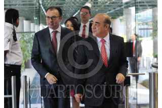 MÉXICO, D.F., 25MARZO2015.- Luis Videgaray, secretario de Hacienda y Crédito Público, y Jesus Murillo Karam, titular de la Secretaría de Desarrollo Agrario, Territorial y Urbano, encabezaron el evento de presentación de las medidas de impulso para la construcción de vivienda promovida por dichas dependencias federales. FOTO: DIEGO SIMÓN SÁNCHEZ /CUARTOSCURO.COM