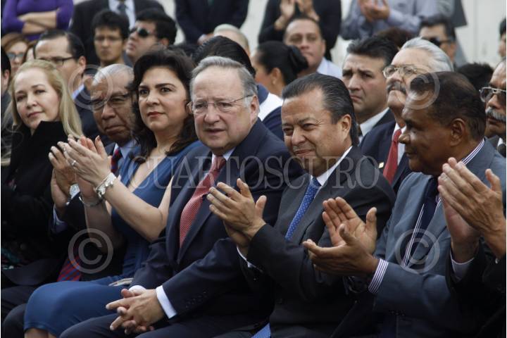 MÉXICO, D.F., 25MARZO2015.- Ivonne Ortega, secretaria general del PRI, Jesús Reyes Heroles, hijo del ideólogo priista y César Camacho Quiroz, dirigente nacional del tricolor, conversan con la Nieta de Heriberto Jara, Alicia Sánchez Jara, al finalizar la ceremonia en donde se develó un monumento de Jesús Reyes Heroles en la explanada del CEN del PRI. FOTO: MOISÉS PABLO /CUARTOSCURO.COM