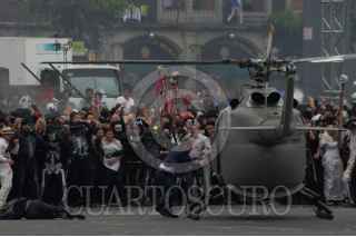 MÉXICO, D.F., 28MARZO2015.- El doble del actor de Daniel Craig, quien interpreta al agente secreto James Bond “007”, realizó la grabación de una escena de acción en donde abordó un helicóptero. Parte del rodaje de la cinta “Spectre” se realiza en el Zócalo capitalino. Se prevé que el último día de grabación sea el lunes 30 de marzo. La película está siendo dirigida por Sam Mendes y producida por Barbara Broccoli. Para realizar el rodaje en la zona del Centro Histórico, la producción solicitó permiso al gobierno capitalino con un mes de anticipación. FOTO: MARÍA JOSÉ MARTÍNEZ HERRERA /CUARTOSCURO.COM