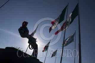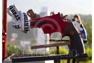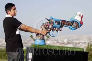 MONTERREY, NUEVO LEÓN, 30MARZO2015.- La fundación de Yoko Ono inauguró en la ciudad “Pistolas por la Paz” que durante 18 años ha recorrido 23 países promoviendo la paz y en regiones donde ha habido violencia. El equipo de los Rayados le Monterrey fueron los elegidos en América Latina para crear una pistola, La exhibición se encuentra en la explanada del Mirador asta bandera. FOTO: GABRIELA PÉREZ MONTIEL / CUARTOSCURO.COM