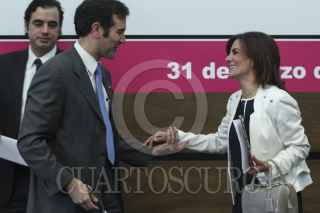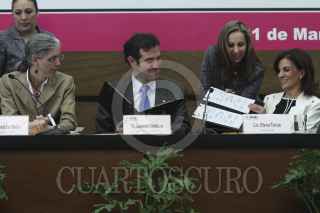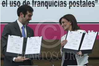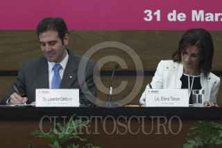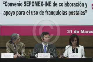 MÉXICO, D.F., 31MARZO2015.- El presidente del Instituto Nacional Electora Lorenzo Córdova y la directora general del Servicio Postal Mexicano, Elena Tanus, realizaron la firma del convenio de colaboración para este próximo ejercicio electoral 2015. Esta alianza se ha realizado desde el año 1977, la cual tiene como objetivo concretar las prerrogativas de partidos políticos y candidatos independientes. El mayor objetivo de SEPOMEX es potencial izar el voto de los mexicanos que viven en el extranjero, para el año 2018 no solo se espera la votación para presidente si no también la de senadores y diputados. FOTO: ISABEL MATEOS /CUARTOSCURO.COM