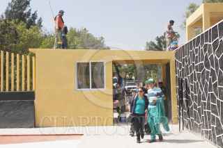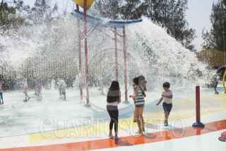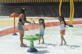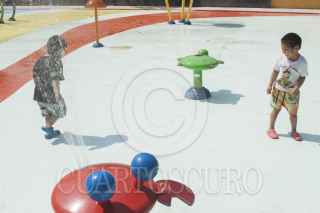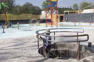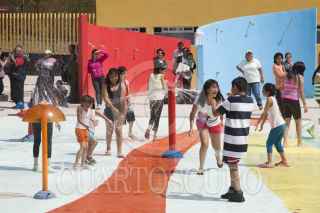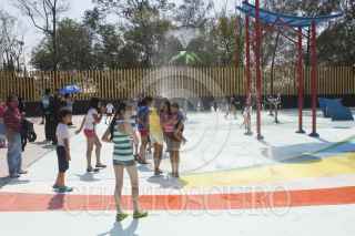 MÉXICO, D.F., 01ABRIL2015.- A marcha forzadas y dándole todavía algunas manos de pintura el Parque Acuático Las Águilas dentro del parque del mismo nombre en la delegación Álvaro Obregón, ante la demora de su "inauguración" los organizadores tuvieron que echar andar las fuentes para que los niños que habían llegado desde temprano estrenarán estas instalaciones. FOTO: MOISÉS PABLO /CUARTOSCURO.COM
