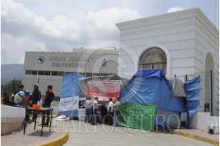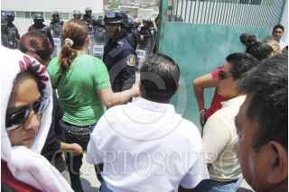 CHILPANCINGO, GUERRERO, 08ABRIL2015.- Trabajadores de la Ciudad Judicial de Guerrero se jalonearon en un intento de recuperar sus instalaciones con granaderos que resguardan el lugar. Xóchitl Jiménez Pita, Secretaria de Trabajo y Conflicto del Sindicato de Servidores Públicos del Poder Judicial del Estado, acusan al gobernador sustituto Rogelio Ortega Martínez y al magistrada presidente del Tribunal Superior de Justicia del Estado, Lambertina Galena Marín, de la represión que sufrieron esta mañana FOTO: JOSÉ I. HERNÁNDEZ / CUARTOSCURO.COM