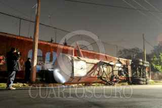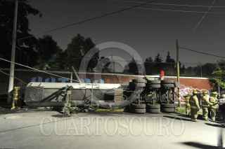 MÉXICO D. F., 09ABRIL2015.- Una pipa de la delegación Iztapalapa que transportaba agua potable, volcó al hundirse el piso en el que apoyaba los gatos que sostenían este contenedor, sobre la calle Moctezuma de la colonia Ampliación Pueblo de Los Reyes Culhuacán. Dicho contenedor, causo daños a la barda perimetral del CETIS 6. Al lugar, acudieron bomberos y personal de P.C. para valorar los daños y retirar el pesado tanque. FOTO: LUIS CARBAYO /CUARTOSCURO.COM