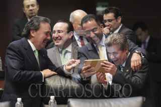 MÉXICO, D.F., 09ABRIL2015.- Los senados Emilio Gamboa, Javier Lozano y Enrique Burgos se divierten con con algo que ven en una tablet durante la sesión. FOTO: SENADO /CUARTOSCURO.COM