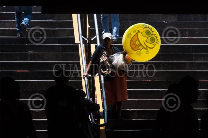 MÉXICO, D.F., 10ABRIL2015.- Una mujer de la tercera edad vende globos en las escaleras del metro Chapultepec. FOTO: MOISÉS PABLO /CUARTOSCURO.COM