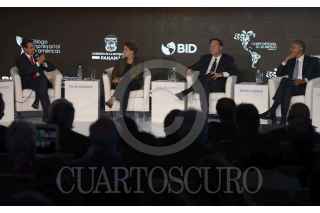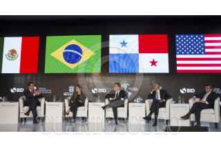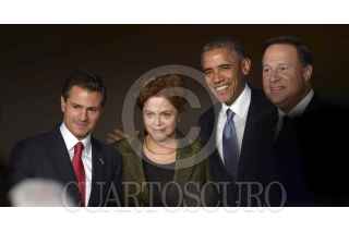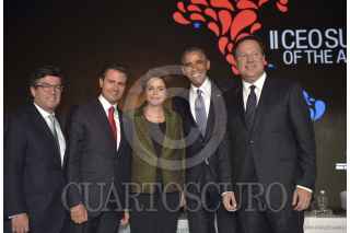 PANAMÁ, PANAMÁ, 10ABRIL2015.- El Primer Mandatario mexicano, Enrique Peña Nieto participó, junto con sus homólogos de Estados Unidos, Barack Obama; de Brasil, Dilma Rousseff, y de Panamá, Juan Carlos Varela, en la II Cumbre Empresarial de las Américas, donde afirmó que más allá de cualquier coyuntura, “hoy trabajamos con un rumbo muy claro en la materialización e instrumentación de las reformas alcanzadas”, para que los emprendedores de nuestro país puedan tener espacio de crecimiento y de presencia. En la imagen Luis Alberto Moreno, presidente del Banco Interamericano de Desarrollo, Enrique Peña, presidente de México, Dilma Rousseff, presidenta de Brasil, Barack Obama, presidente de Estados Unidos y Juan Carlos Varela, presidente de Panamá. FOTO: PRESIDENCIA /CUARTOSCURO.COM