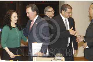 MÉXICO, D.F., 13ABRIL2015.- Héctor Gutiérrez de la Garza, diputado del PRI; Dolores Padierna Luna, senadora del PRD; al finalizar la reunión que sostuvieron los coordinadores de los diversos grupos parlamentarios de la Cámara de Diputados y de Senadores. FOTO: CUARTOSCURO.COM