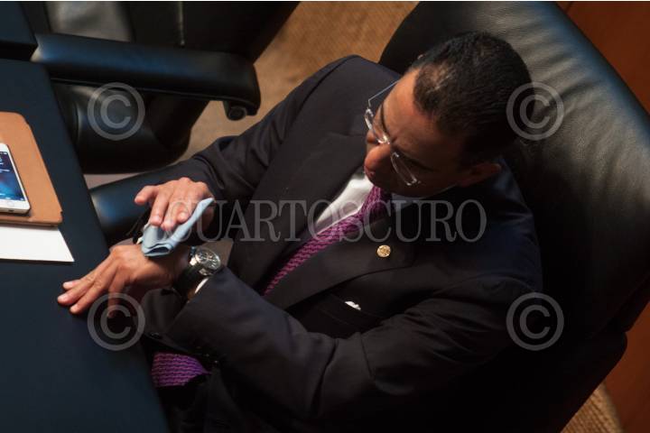 MÉXICO, D.F., 14ABRIL2015.- El senador Javier Lozano limpia su reloj en la sesión de la Cámara de Senadores. FOTO: MOISÉS PABLO /CUARTOSCURO.COM