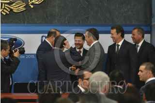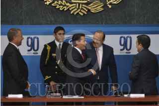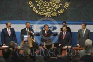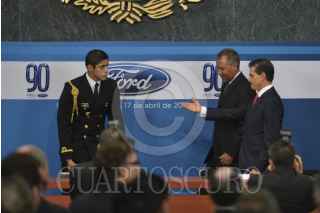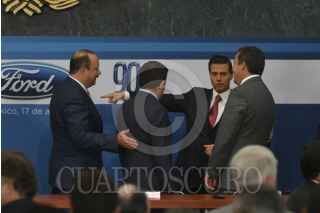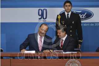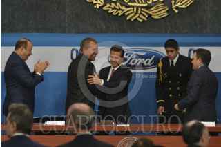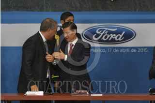 MÉXICO, D.F., 17ABRIL2015.- César Horacio Duarte Jáquez, gobernador de Chiahuahua, Ildefonso Guajardo Villareal, secretario de Economía, Enrique Peña Nieto, presidente de México, Miguel Márquez Márquez, gobernador del estado de Guanajuato y Joseph Hinrichs, presidente de Ford para las Américas, durante el anuncio de Inversión de los Proyectos de Motores y Transmisiones de Ford Motor Company en México, el cual pretende ampliar dos de sus fabricas, en el estado de Guanajuato y Chihuahua. FOTO: ADOLFO VLADIMIR/CUARTOSCURO.COM