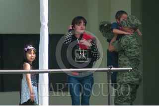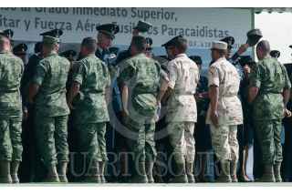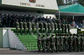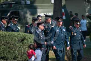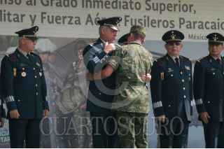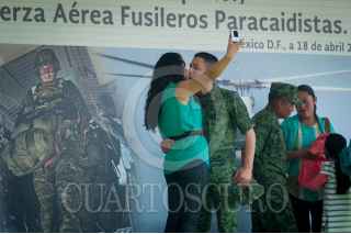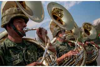 MÉXICO, D.F., 18ABRIL2015.- Banda de música del ejército y fuerza aérea mexicanos durante una ceremonia de imposición de ascensos al grado inmediato superior, de 112 cabos de las armas, policía militar y fuerza aérea fusileros paracaidistas. FOTO: DIEGO SIMÓN SÁNCHEZ /CUARTOSCURO.COM