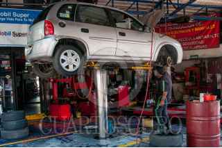 MÉXICO, D.F., 20ABRIL2015.- Un mecánico automotriz trabaja debajo de un auto que fue elevado para una mejor efectividad a la hora de ser reparado. FOTO: DIEGO SIMÓN SÁNCHEZ /CUARTOSCURO.COM