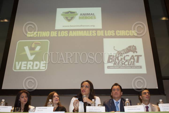 MÉXICO, D.F., 21ABRIL2015.- Vanesa Fernández, Big Cats, Carol Basking, Big Cats, Lourdes López, coordinadora de asuntos ambientales del PVEM, Carlos Puente, senador del PVEM y Jesús Sesma, secretario de comunicación del PVEM, hablaron sobre el destino de los animales de los circos, en donde según ellos pretenden construir un santuario en el estado de Chiapas. En el DF se aprobó una ley que prohíbe los espectáculo con animales por lo que los propietarios de estos ejemplares han señalado que no pueden con su manutención. FOTO: MOISÉS PABLO /CUARTOSCURO.COM