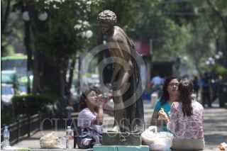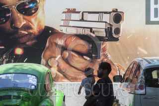 MÉXICO, D.F., 21ABRIL2015.- Padre e hijo pasan frente a un cartel publicitario de una película en la que se ensalza la violencia auspiciada por el cine hollywoodense. FOTO: MOISÉS PABLO /CUARTOSCURO.COM