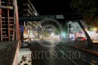 MÉXICO, DISTRITO FEDERAL., 23ABRIL2015.- Un tráiler que intentaba incorporarse a la avenida Constituyentes por la calle Francisco Fagoada en la colonia San Miguel Chapultepec, quedo atorado en un marco que soportaba un letrero con la leyenda: Prohibido tránsito pesado, que está ubicado sobre avenida revolución. Por varias horas, laboraron bomberos para retirar e vehículo y dicho letrero que estaba a punto de caer. FOTO: LUIS CARBAYO /CUARTOSCURO.COM