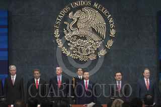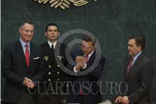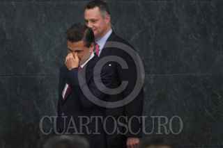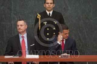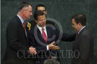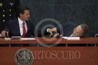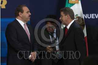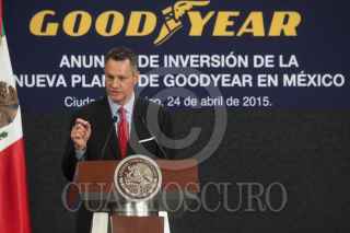 MÉXICO, D.F., 24ABRIL2015.- Mario García Valdez, presidente municipal de San Luis Potosí y Fernando Toranzo Fernández, gobernador de San Luis Potosí, durante el anunció de inversión de la nueva planta de Goodyear en México, la cual estará ubica en San Luis Potosí. FOTO: MOISÉS PABLO /CUARTOSCURO.COM