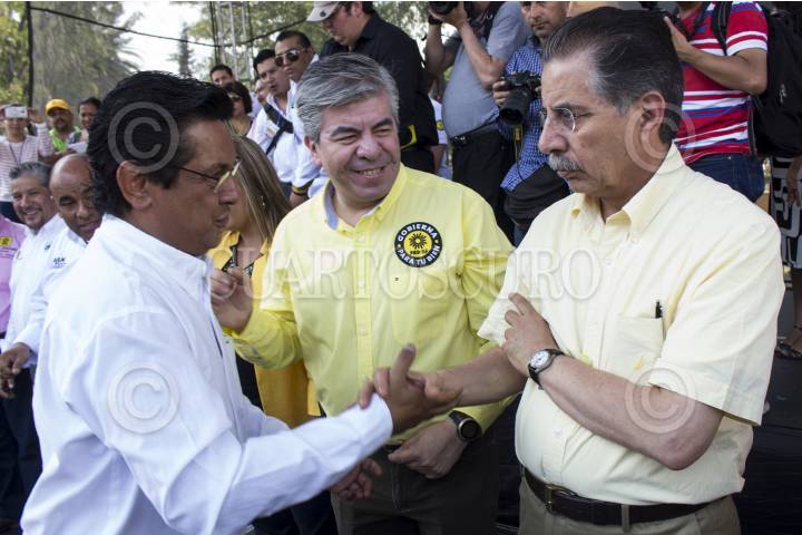 MEXICO, D.F., 25ABRIL2015.- Los candidatos del PRD por la delegación y diputaciones de Iztacalco llevaron a cabo un mítin en la explanada de la demarcación, en el marco de las campañas electorales por los comicios del próximo 7 de julio. Raúl Flores, presidente del PRD DF y Jesús Ortega, acompañaron a Carlos Estrada Meráz, Diego Ordóñez, Elizabeth Mateos y Julio Anaya, candidatos del Sol Azteca para la demarcación. En la imagen, Raúl Flores y Jesús Ortega intercambian comentarios durante el mítin. FOTO: DAVID POLO /CUARTOSCURO.