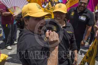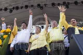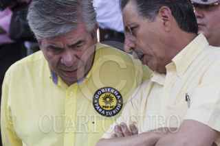 MEXICO, D.F., 25ABRIL2015.- Los candidatos del PRD por la delegación y diputaciones de Iztacalco llevaron a cabo un mítin en la explanada de la demarcación, en el marco de las campañas electorales por los comicios del próximo 7 de julio. Raúl Flores, presidente del PRD DF y Jesús Ortega, acompañaron a Carlos Estrada Meráz, Diego Ordóñez, Elizabeth Mateos y Julio Anaya, candidatos del Sol Azteca para la demarcación. En la imagen, Raúl Flores y Jesús Ortega intercambian comentarios durante el mítin. FOTO: DAVID POLO /CUARTOSCURO.