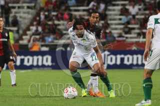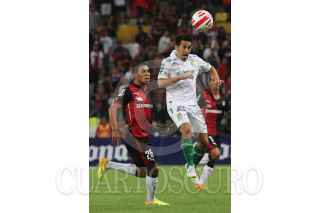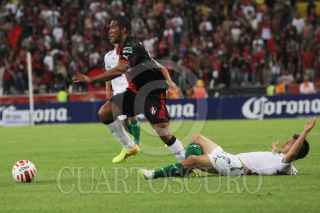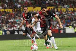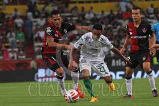 GUADALAJARA, JALISCO. 25ABRIL2015.- El jugador de Atlas Christian Suarez, disputa un balón frente al contrario de León Fernando Navarro, esto en partido correspondiente a la Jornada 15 del Torneo Clausura 2015 de la Liga MX, en donde se enfrentan los equipos del Atlas frente a León en partido que se celebra en el Estadio Jalisco. FOTO: FERNANDO CARRANZA GARCIA / CUARTOSCURO.COM