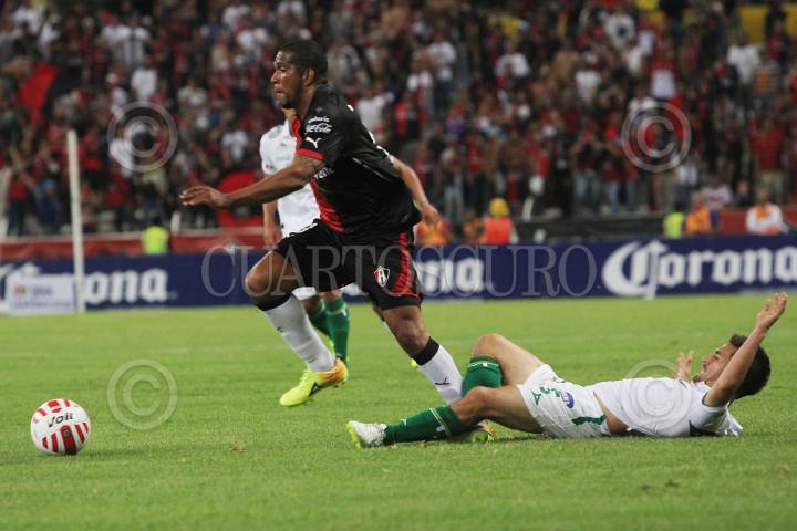 GUADALAJARA, JALISCO. 25ABRIL2015.- El jugador de Atlas Christian Suarez, disputa un balón frente al contrario de León Fernando Navarro, esto en partido correspondiente a la Jornada 15 del Torneo Clausura 2015 de la Liga MX, en donde se enfrentan los equipos del Atlas frente a León en partido que se celebra en el Estadio Jalisco. FOTO: FERNANDO CARRANZA GARCIA / CUARTOSCURO.COM