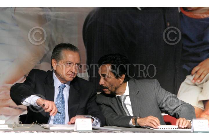 MEXICO, D.F., 20ABRIL2006.- Vicente Fox, presidente de la República y Víctor Flores, líder ferrocarrilero, durante la ceremonia de la XC Sesión Ordinaria de la Honorable Asamblea General del INFONAVIT, en su sede nacional. FOTO: Moisés Pablo/CUARTOSCURO.COM