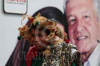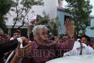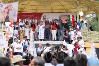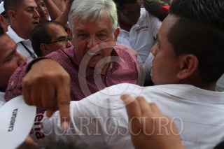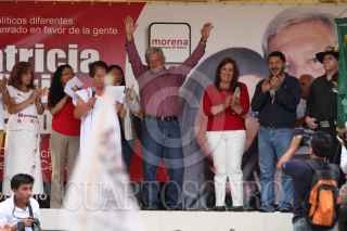 MÉXICO, D.F., 27ABRIL2015.- Andrés Manuel López Obrador, presidente del consejo de MORENA, acompañado de Patricia Ruiz Anchondo, candidata de MORENA a jefa delegacional en Venustiano Carranza, Irma Lara López, Teresa Garduño, Alejandra Ramírez, Alejandra Bernal y Jaime López Vela, candidatos para diputados federales y locales, durante el mitin de campaña en la Plaza de la Aviación ubicado en la colonia Moctezuma FOTO: SAÚL LÓPEZ /CUARTOSCURO.COM