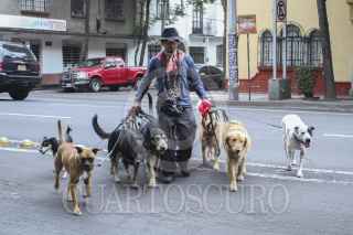 MÉXICO, D.F., 28ABRIL2015.- El oficio de paseador de perros cada día es más común en las zonas residenciales de la ciudad de México. Jóvenes se alquilan para sacar a pasear a sus perros, en algunas ocasiones llevan en sus manos hasta 12 perros de diferentes razas, todos sujetados firmemente con sus correas. FOTO: ISABEL MATEOS /CUARTOSCURO.COM