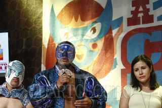 MÉXICO, D.F., 29ABRIL2015.- Los luchadores Blu Panther, Super Porky Brazo de Plata, Guerreo Maya, Delta, Gala Lutero y Guadalupe Aleman durante la presentación del 1er Concurso de Cuento de Lucha Libre "A Dos de Tres Cuartillas" en donde niños de entre 7 y 12 años de edad participaran con un cuento original en que la temática principal sea la lucha libre del CMLL. FOTO: RODOLFO ANGULO /CUARTOSCURO.COM
