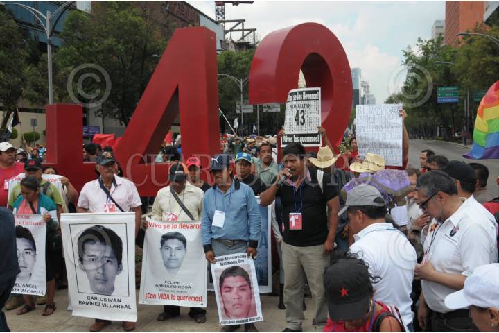 MÉXICO, D.F., 01MAYO2015.- Padres de los normalistas desaparecidos de la normal de Ayotzinapa encabezaron la marcha para conmemorar el día del trabajo en compañía de organizaciones obreras de todo el país. Durante la marcha realizaron una parada en el antimonumento +43 para realizar un mitin. FOTO: DIEGO SIMÓN SÁNCHEZ /CUARTOSCURO.COM