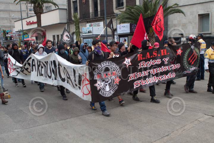 MÉXICO, D.F., 01MAYO2015.- Rojos y Anarquistas Skinheads marcharon del Monumento a la Revolución al Zócalo en el marco de las movilizaciones del Día del Trabajo. Los jóvenes fueron escoltados por un abundante operativo policíaco sin que se presentarán incidente alguno. FOTO: MOISÉS PABLO /CUARTOSCURO.COM