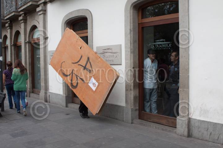 MÉXICO, D.F., 01MAYO2015.- Rojos y Anarquistas Skinheads marcharon del Monumento a la Revolución al Zócalo en el marco de las movilizaciones del Día del Trabajo. Los jóvenes fueron escoltados por un abundante operativo policíaco sin que se presentarán incidente alguno. FOTO: MOISÉS PABLO /CUARTOSCURO.COM
