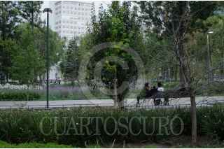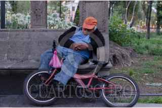MÉXICO, D.F., 02MAYO2015.- Soñando sobre ruedas, un hombre reposa recargado en su bicicleta. El paseo ha llegado a su fin. La meta fue la Alameda Central. FOTO: MARÍA JOSÉ MARTÍNEZ /CUARTOSCURO.COM
