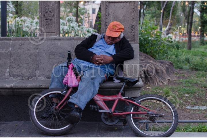 MÉXICO, D.F., 02MAYO2015.- Soñando sobre ruedas, un hombre reposa recargado en su bicicleta. El paseo ha llegado a su fin. La meta fue la Alameda Central. FOTO: MARÍA JOSÉ MARTÍNEZ /CUARTOSCURO.COM