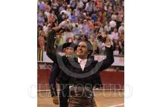 AGUASCALIENTES, AGUASCALIENTES, 04MAYO2015.- El rejoneador Emiliano Gamero se lució anoche en la Plaza de Toros Monumental de Aguascalientes, en el marco de la Feria de San Marcos. El torero fulminó a la res con un un certero estoque, además de llevarse el rabo y las dos orejas, para el beneplácito de los espectadores. FOTO: GABINO ACEVEDO /CUARTOSCURO.COM