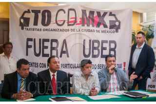 MÉXICO, D.F., 04MAYO2015.- Ignacio Rodríguez, Francisco Cornejo, Daniel Medina y José Luis Ramírez, voceros de la organización Taxistas Organizados de la Ciudad de México, ofrecieron una conferencia de prensa para postular su rechazo ante la posibilidad de que los servicios de transporte individual que operan con aplicaciones móviles, como Uber y Cabify, sean regulados bajo un esquema de control equitativo respecto al sector concesionado. FOTO: DIEGO SIMÓN SÁNCHEZ /CUARTOSCURO.COM