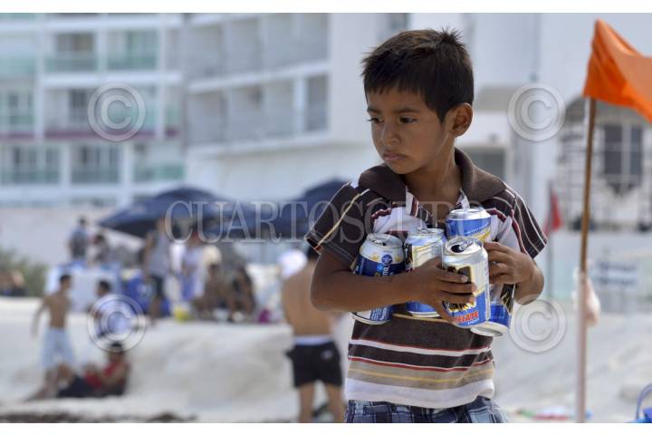 CANCUN, QUINTANA ROO, 05MAYO2015.-Un niño camina en playa Gaviota de este destino turístico recogiendo latas vacías de cerveza y refresco para así poder venderlas y ayudar al gasto familiares. FOTO: ELIZABETH RUIZ /CUARTOSCURO.COM