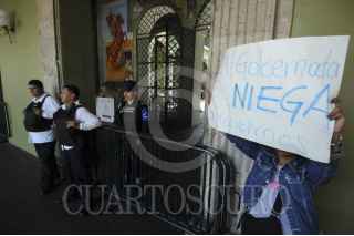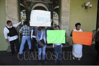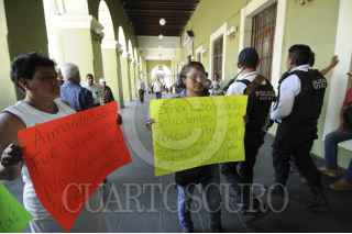 XALAPA, VERACRUZ, 08MAYO15.-María Isabel Jasso Aguilar, esposa de Armando Saldaña, periodista veracruzano asesinado y encontrado en Cosolapa en los limites de Veracruz y Oaxaca, acompañada por su hija Cristina Saldaña Jasso y su cuñada Delfina Saldaña Morales, arribaron a la capital del estado en donde dieron una conferencia de prensa al filo de banqueta para acusar que a 7 días del crimen ninguna autoridad oaxaqueña o veracruzana ha intentado comunicarse con ellas. Las mujeres familiares del comunicador asesinado se dirigieron al Palacio de Gobierno con pancartas en mano solicitando una audiencia con el gobernador Javier Duarte de Ochoa; con el fiscal Luis Ángel Bravo y el secretario de gobierno Gerardo Buganza, obteniendo como respuesta ser fotografiadas por elementos de la SSP y la negativa por parte del personal de política regional con el argumento de que ninguno se encontraba en sus lugares de trabajo pues se encontraban en junta. La esposa, hija y hermana de Armando Saldaña fueron atendidas por integrantes de la Comisión de Atención y Protección a Periodistas (CEAPP) quienes llegaron a atenderlas una hora y media después de que las manifestantes solicitaran atención por alguna autoridad en el Palacio de Gobierno. FOTO: RUBÉN ESPINOSA / CUARTOSCURO.COM
