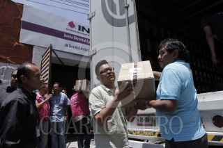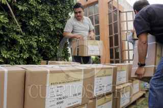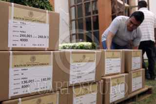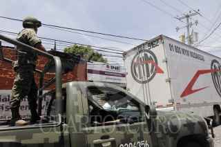 PUEBLA, PUEBLA, 09MAYO20015.- Arriba paquetería electoral con las boletas para la elección de diputados federales a las juntas distritales del Instituto Nacional Electoral INE, el flete fue escoltado por elementos del ejercito. FOTO: HILDA RÍOS/ CUARTOSCURO.COM