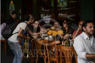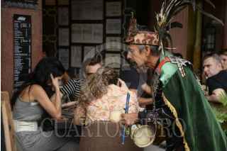 MÉXICO, D.F., 10MAYO2015.- Con un vestido típico de nuestros ancestros los Aztecas, un anciano baila y toca música prehispánica, solicitando a los comensales unas monedas. FOTO: ISABEL MATEOS /CUARTOSCURO.COM