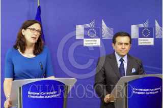 BRUSELAS, BÉLGICA, 11MAYO2015.- En gira de trabajo en el país europeo, Ildefonso Guajardo Villarreal, secretario de economía, se reunió con la comisaria europea de Comercio de la Unión Europea, Cecilia Malmström. Ambos anunciaron la actualización del Tratado de Libre Comercio entre México y la Unión europea que entró en vigor en el año 2000. FOTO: CUARTOSCURO.COM