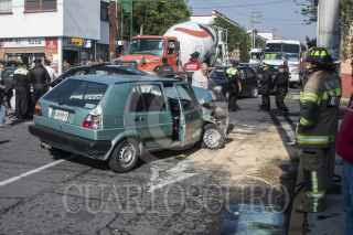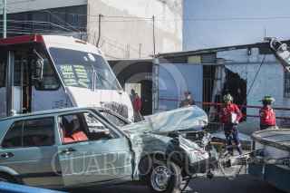 TOLUCA, EDO, MEX., 12MAYO2015.- Dos personas resultaron lesionadas tras un choque entre un camión de pasajeros y un vehículo particular, la unidad de la línea de Autotransportes Xinantécatl, con matrícula 713-59- J y un Golf con placas LSG 4912, que impactaron en la esquina de Avenida Independencia y González Arratia, en la Colonia Santa Clara. Tras la colisión, el autobús impactó contra un local comercial que alberga un acuario, en el número 925 de la Avenida Independencia, donde derribó un muro. Elementos de la Coordinación de Protección Civil y Bomberos se movilizaron al lugar para acordonar y verificaron que los vehículos no presentaran fugas de combustible. FOTO: TONATIU CRUZ /CUARTOSCURO.COM