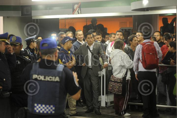 MÉXICO D. F., 13MAYO2015.- Fallas en el sistema de vías del transporte colectivo metro, provoco que se suspendiera el servicio minutos antes de lo normal. Ocasionando, que los usuarios de este servicio desesperaran ante su reanudación, negándose a abandonar los andenes de la estación Buenavista. Por este motivo, la SSPDF, implemento un operativo como servicio alterno, que traslado a los pasajeros hasta los destinos de las estaciones que recorren las líneas 8 y B, trasladando aproximadamente a 700 usuarios alrededor de las 01:00 horas. FOTO: LUIS CARBAYO /CUARTOSCURO.COM