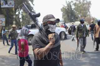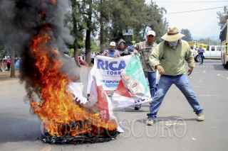 LOS REYES, MICHOACÁN, 14MAYO2015.- Comuneros mantienen bloqueada la carretera Los Reyes-Peribán para exigir la aparición con vida de un joven jornalero que desapareció el pasado martes 12 de mayo. Comunitarios de Cherato, Cheratillo, Uruscato y 18 de Marzo, cerraron la vialidad desde las 11:00 horas, acusan a los elementos de la Fuerza Rural de estar involucrados en la desaparición de Miguel Vidales, de 25 años. Los manifestantes señalaron que la familia Vidales recibió un mensaje que decía que supuestamente lo habían matado por error, pues lo confundieron con otra persona, sin embargo el jornalero continúa desaparecido. al bloqueo arribó una patrulla de la Fuerza Rural, sin embargo los comunitarios les exigieron que se retiraran mientras les gritaban “¿Qué cuidan? ¿Dónde están nuestros familiares?”. FOTO: JUAN JOSÉ ESTRADA SERAFÍN /CUARTOSCURO.COM