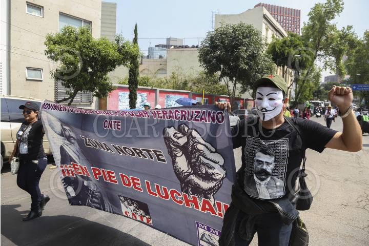 MÉXICO, D.F., 15MAYO2015.- Maestros de diversas secciones de la CNTE y SNTE, marcharon de la SEGOB hacia el zócalo de la Ciudad de México. al rededor de las 15:00 horas policías antimotines de la SSP-DF les impidieron el paso frente al palacio de Bellas Artes. Los líderes de los docentes determinaron realizar un mitin sobre la avenida Juárez después que granaderos les impidieran el paso. FOTO: SAÚL LÓPEZ /CUARTOSCURO.COM