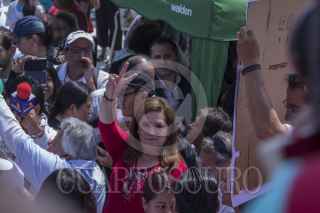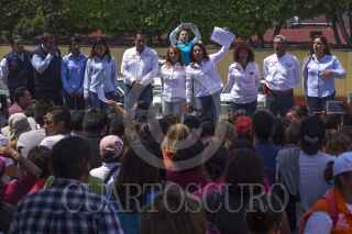 MÉXICO, D.F., 17MAYO2015.- Candidatos a la Jefatura Delegacional de Venustiano Carranza, Llilián López de Nava (PAN), Esthela Damián (MC), Diana Hernández Muñoz (Nueva Alianza) y Patricia Ruiz (MORENA) ofrecieron una conferencia de prensa y un mensaje a los ciudadanos de la demarcación para informar que la gente no puede recibir apoyos condicionados por el voto hacia algún partido político en especial. FOTO: ENRIQUE ORDÓÑEZ /CUARTOSCURO.COM
